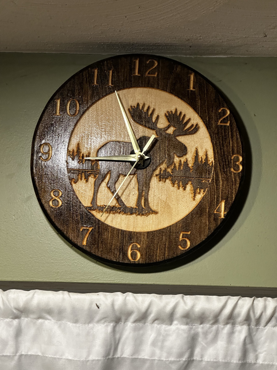 This rustic wooden clock features a beautiful, cnc-cut image of a moose standing in a forest. The image is accented with a…